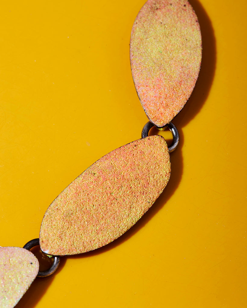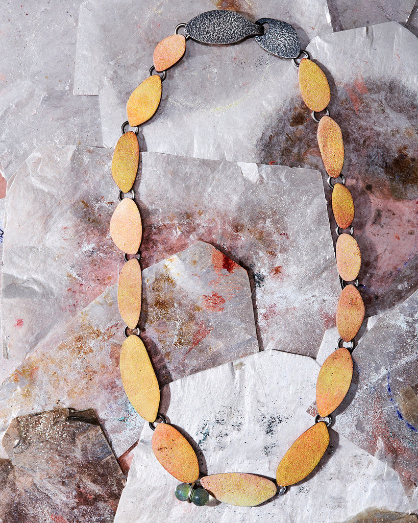 enamel on copper, sterling silver, pigment, glass
