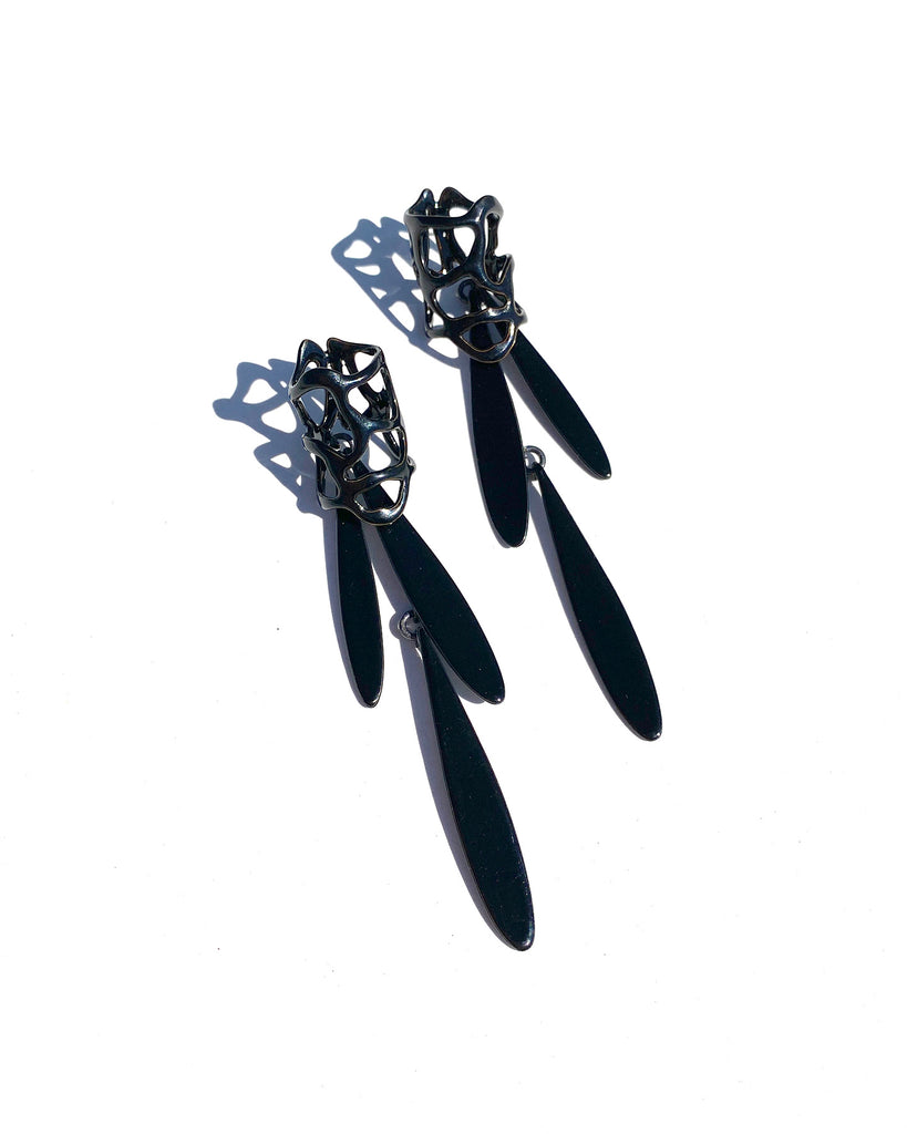 An earring style for those who love a long “shoulder duster’ style earring. The top sculptural form sits high on the ear and a cascade of linear fringe swings from the base. This style can be customized for length. Please communicate a length adjustment request in “notes” at checkout.
