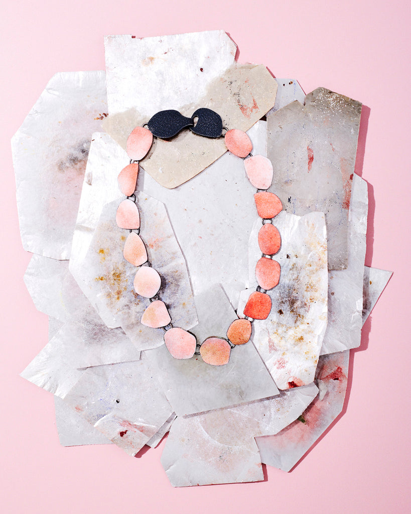 A simple silhouette holds space for textured and varied enamel tiles that move fluidly with the body. The individual links are hand painted and feature a final layer of under fired glass that sparkles and shifts in the light. The design sits high on the neck, additional custom links can be added for desired length (upon request).